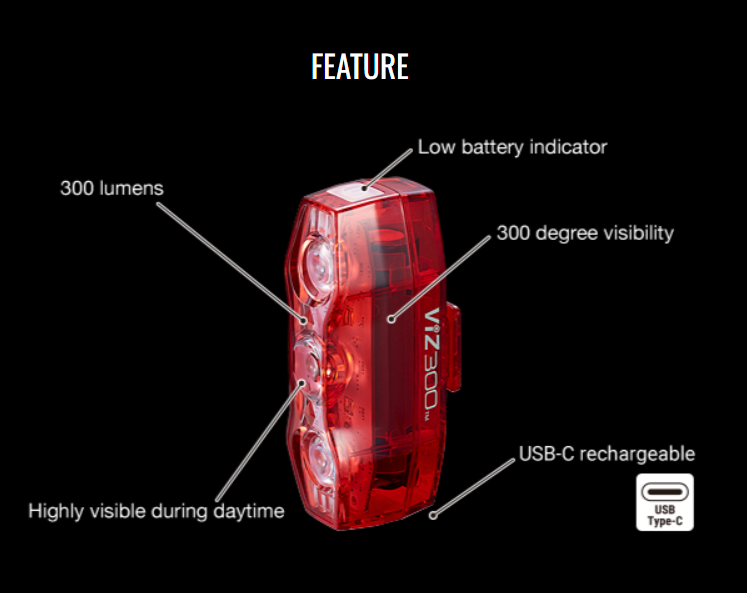 Pumping out an attention-grabbing 300 lumens with OptiCube™ lens technology, the versatile ViZ300 stands out with the power of Daytime HyperFlash™ mode and the friendliness of Group Ride mode.