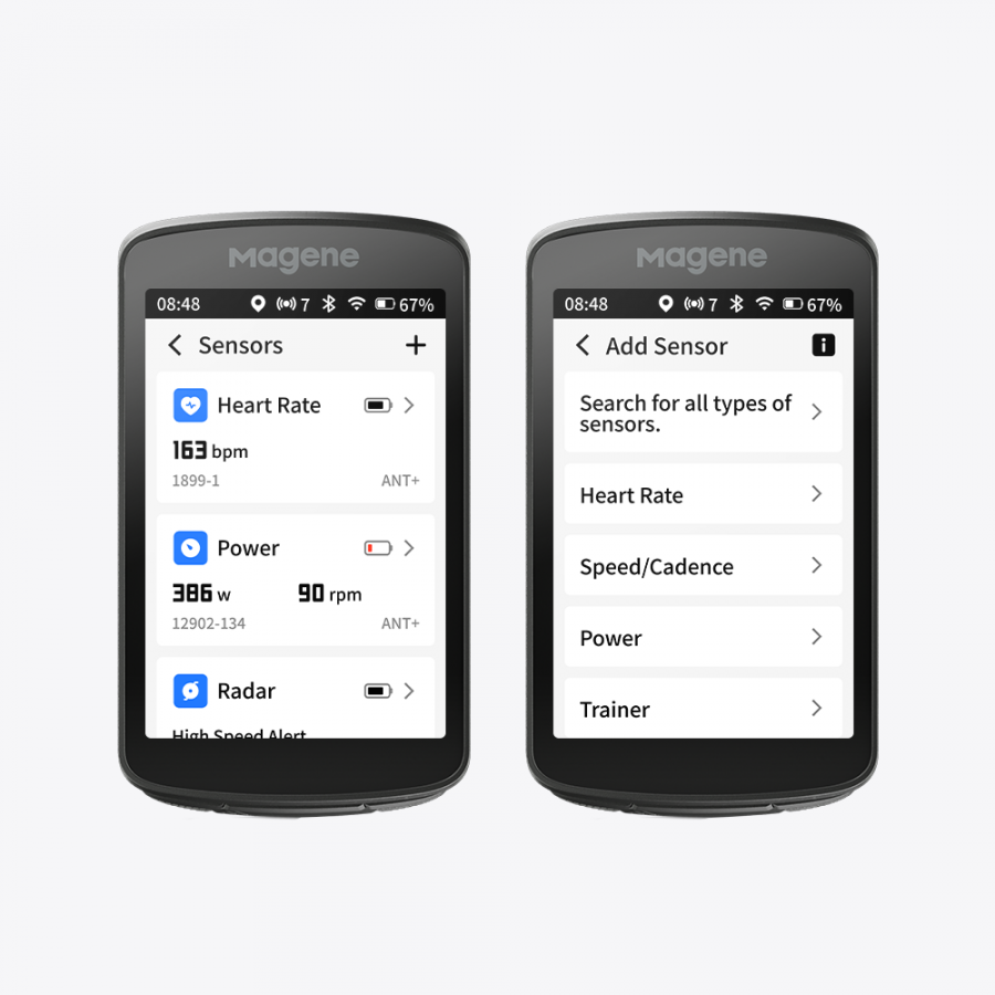 Through ANT+ and Bluetooth wireless protocols, it can connect to a diverse range of sensors and display the battery and real-time data on sensor page.