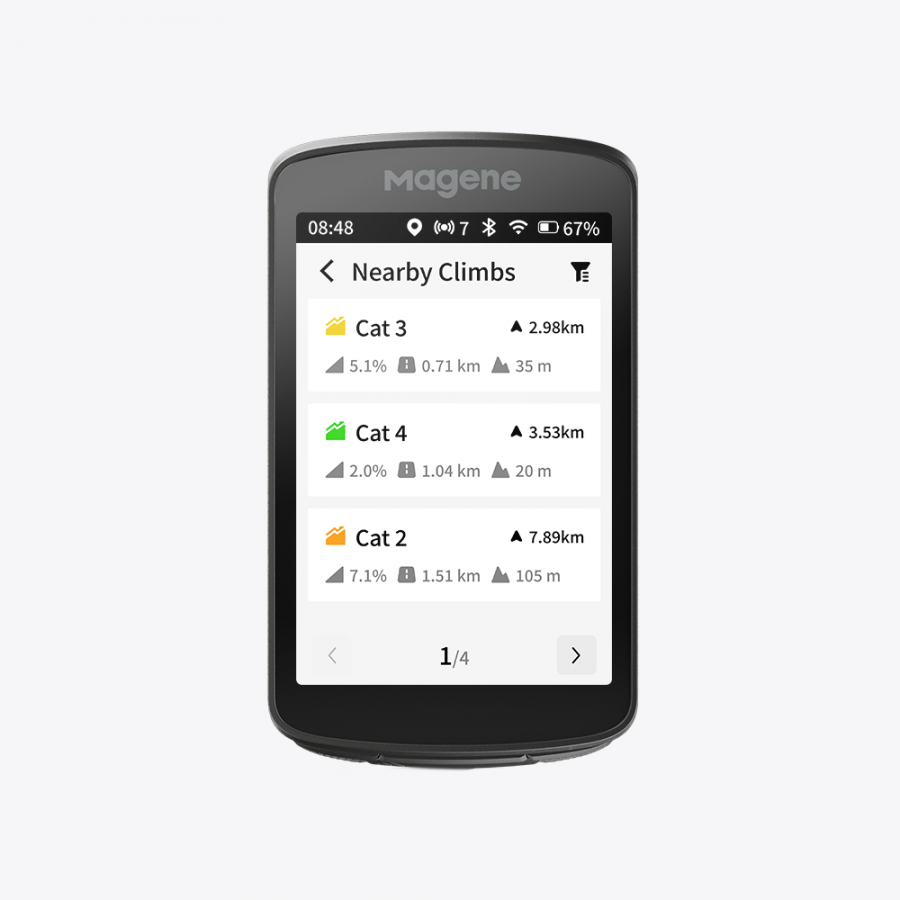 Nearby Climbs: Filter climbs by category (HC, Cat 1–4) to match every climb to your ability and goals. While riding, use the Nearby Climbs screen to view climbs around you in real time. Tap the navigation button to head straight to the start of any climb.