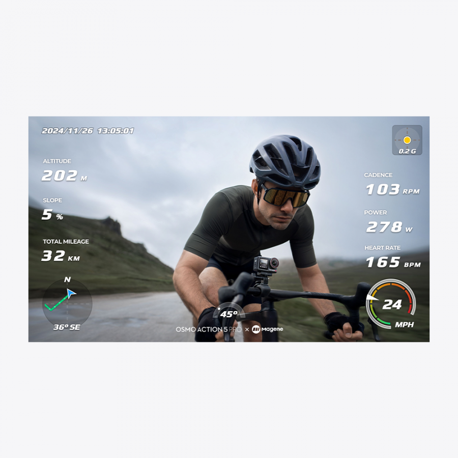 Auto‑Embedded Ride Data | Transform Your Video into a “Pro Dashboard”: Every exported video automatically overlays key ride metrics—speed, time, distance, gradient, elevation, heading and more. No post‑production syncing needed. Your footage becomes a data‑rich cycling documentary ready for training review, technique sharing, or highlight reels.