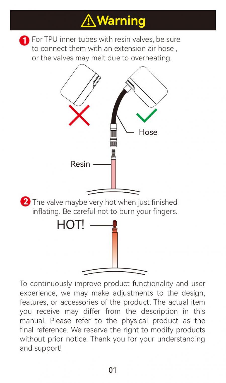 Note-2 - For TPU inner tubes with resin valves, be sure to connect them with an extension air hose or the valves may melt due to overheating.