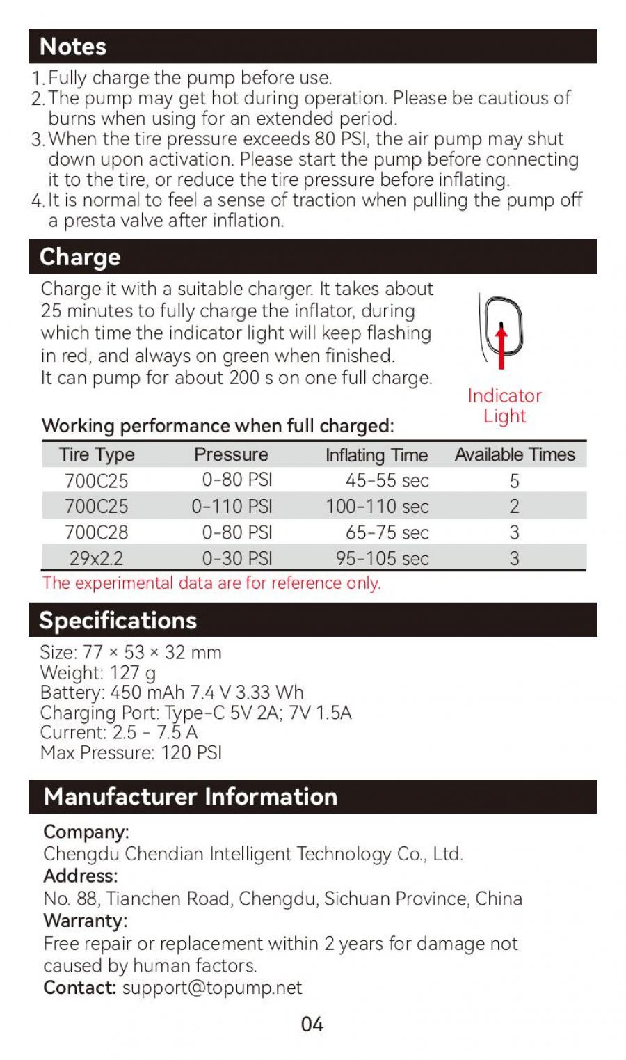 Weighing just 127g and measuring 77x53x32mm, the TOPUMP Mini Electric Bike Pump is compact and easy to carry. Simple one-button operation ensures ease of use.